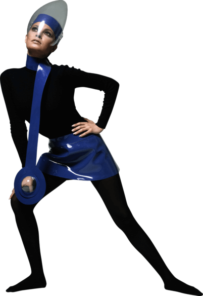 В 60-е годы дизайнеры активно экспериментируют с новыми материалами: нейлоном, винилом, полиуретаном, дакроном, — а также с силуэтами и формами, вызывающими ассоциации с космосом. Пьер Карден, Пако Рабан и Андре Курреж придумывают совершенно инопланетные образы. Эмилио Пуччи создает для авиакомпании Braniff униформу для стюардесс с прозрачными шлемами, как у космонавтов.